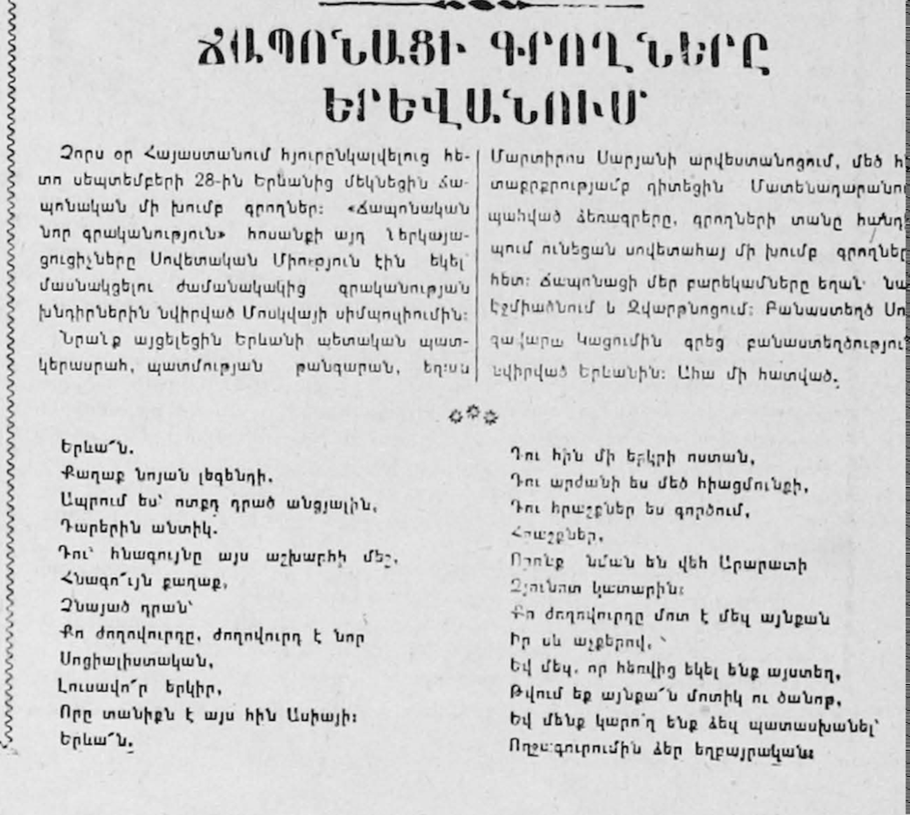 [1]Խորհրդային միություն կատարած այցի շրջանակում լինում են նաև Հայաստանում, հանդիպում են հայ գործընկերների հետ, այցելում Էջմիածին, Հաղթանակի այգի, Սարյանի արվեստանոց, գինու գործարան և այլն։ Հայտնի է, որ 1960-ական և 1970-ական թվականներին նույնպես մի խումբ ճապոնացի գրողներ եղել են Հայաստանում։ Ի դեպ, 1965 թվականին Հայաստան այցելած պոետ Սուգավարա Կացումին (1911-1988) նույնիսկ բանաստեղծություն է նվիրել Երևանին։ Հայ գրողներից Ճապոնիա այցելելու հնարավորություն են ունեցել Նաիրի Զարյանը (1961 թ.), Արտաշես Քալանթարյանը (1965 թ.), Սիլվա Կապուտիկյանը (1972 թ.) և ուրիշներ[2]։