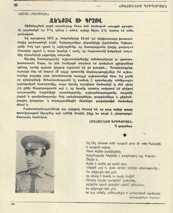 Եվ այսպիսով 1971 թ. հոկտեմբերի 13-ին ես` «երիտասարդ խոստումնալից բանաստեղծ Հովհ. Գրիգորյանից» վերածվեցի լեյտենանտ Գրիգորյանի: Իսկ եթե դրան էլ ավելացնենք, որ ծառայությանս վայրը բավական հեռավոր շրջան է, ապա կարելի է ասել, որ Հայաստանի իսկական անդամից վերածվեցի թղթակից անդամի:
